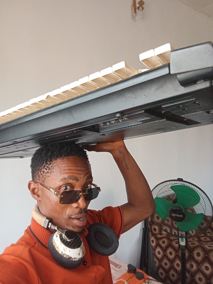 - "An adult male is depicted indoors in Adankolo, Nigeria, holding a black digital piano or electronic keyboard on his head with his left hand" by FM-njz8m2, licensed under CC BY 4.0