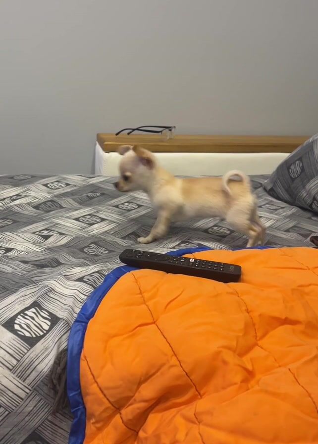 A tan-colored Chihuahua puppy with a short tail walks around on a bed with gray patterned sheets. The dog is on an orange and blue sleeping bag that is laid on top of the bed. A black TV remote is on the sleeping bag. The camera is static and pointed downwards. A person's leg appears in the bottom-right corner. There is a wooden nightstand with glasses resting on it. Speech can be heard but is in a language other than English.