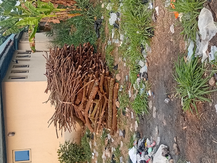 The image displays an outdoor scene within the city of Unknown, Chad. A prominent, large stack of cut wooden branches and logs, some tied with twine, occupies the midground. The ground in the foreground is a mix of bare earth and patches of green grass, extensively littered with numerous white, clear, and black plastic bags, wrappers, and various discarded items. To the left, a light-colored building with a dark roof features a single rectangular window with blue-tinted glass and a wall-mounted light fixture. Adjacent to this, another section of a building or an additional structure displays several narrow, vertically oriented windows. To the right of the firewood stack, a tall banana plant with large green and browning leaves is visible amidst overgrown grass and weeds. No individuals, actions, or interactions are depicted.