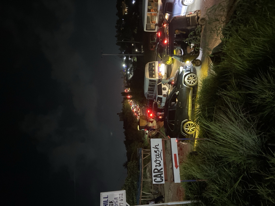 Night view of a congested road. Traffic is heavy with cars, buses, and trucks. A "Car Wash" sign with a red arrow points right, alongside the road. Lush green vegetation lines the roadside. A sign for "Hill Lodge" is also visible. The sky is dark, suggesting late evening or night. Buildings with lit windows are seen in the distance.
