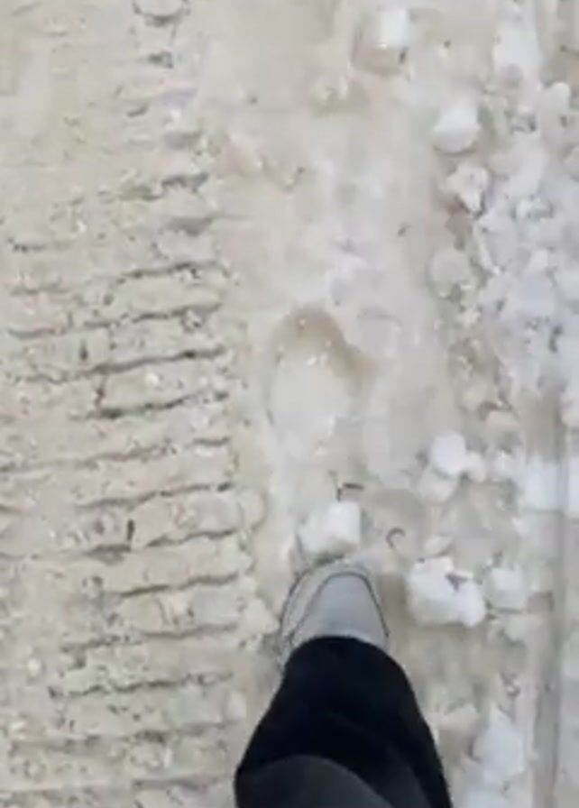 A person wearing black pants and gray tennis shoes walks across a snow-covered surface. The surface appears to be a path or road marked by tire tracks on the left and a thin, darker stripe on the right. The snow is partially melted, with visible clumps and patches of ice.