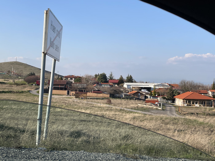The image depicts a semi-rural village landscape, viewed from the interior of a vehicle, in the city of Unknown, Unknown. In the immediate foreground, a dark vehicle frame is visible across the top and bottom, with reflections present on the glass. The ground consists of gravel and dry, light brown grasses. A prominent white rectangular road sign, supported by two gray metal poles, stands in the left-center. The sign features "Ново село" in Cyrillic script and "Novo selo" in Latin script, both crossed out by a diagonal red line, indicating the end of the named locality. The midground features undulating terrain covered predominantly in dry, yellowish-brown grass and sparse green vegetation. A winding, unpaved dirt road or track is visible, leading towards a cluster of buildings. A red truck is partially visible on this road in the left midground. A collection of residential and possibly commercial structures forms a village in the center and right. These include houses with red-tiled roofs, some with light-colored facades, and a larger white building with a gray roof, potentially a workshop or warehouse, where a white van is parked. A red shipping container is located near some of the buildings. On the far right, a building with a distinct orange-tiled roof and light-colored walls features multiple arched window openings, and behind the village structures, a slender minaret-like spire with a pointed top is partially visible. The background on the far left shows a prominent, treeless hill topped with a telecommunications tower or antenna structure. Beyond the village, a hazy horizon line suggests distant hills or mountains. The sky is clear and light blue, with a few small white cumulus clouds. No people are visible, and no discernible actions or interactions are depicted. The scene is illuminated by natural daylight.