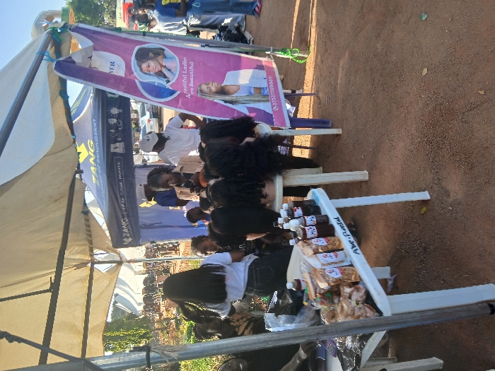 A market stall is set up with various items for sale. The display includes wigs on mannequin heads, jars of what appears to be beauty products, and packaged snacks. The stall has a banner promoting "Beautiful Ladies" with pictures of women. A tent or canopy provides shade. People are milling around the stall, possibly shopping or browsing. The ground is reddish-brown, suggesting a dirt or clay surface.