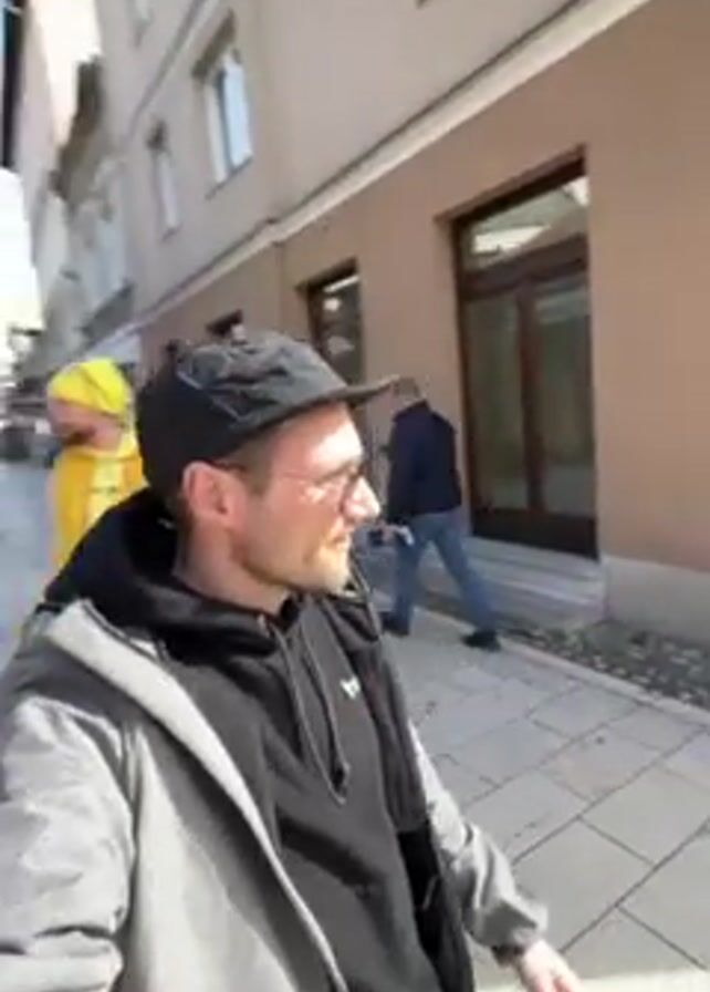 A man wearing sunglasses, a black baseball cap, a black hooded sweatshirt, and a light gray jacket walks on a paved pedestrian street, looking at the camera, then around. Another man wearing a purple shirt and sunglasses walks behind the first man. A third man wearing a yellow jacket walks further ahead. The pedestrian street is lined with buildings, some of which have awnings, and some outdoor seating areas for restaurants. The sky is blue.