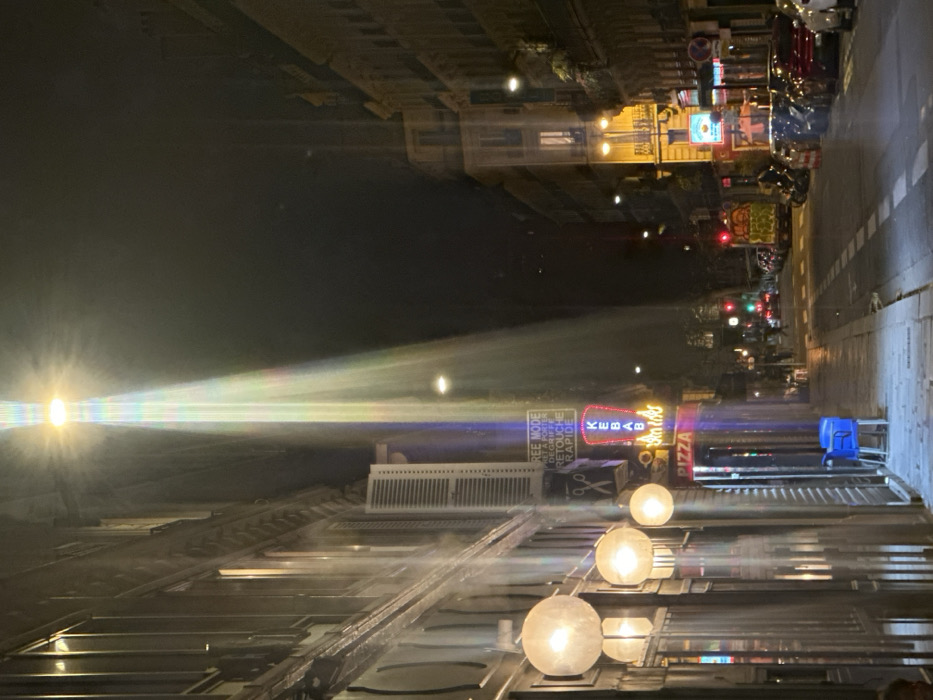 The image displays a nighttime street scene in Paris, France, featuring a narrow urban thoroughfare lined with multi-story, Haussmannian-style buildings. A bright overhead streetlamp emits a prominent, vertically elongated beam of light that exhibits distinct spectral aberrations. On the left, a building's ground floor houses commercial establishments, identifiable by multiple spherical light fixtures and illuminated neon signs reading "KEBAB" and "PIZZA". Above these, a white rectangular sign with a scissors logo advertises "FREE MODE DEGRIFF RETOUCHE RAPIDE." A blue plastic chair and a smaller blue stool are placed on the sidewalk near these storefronts. The pavement appears wet, reflecting light. The street itself is marked with white dashed lines, and numerous vehicles are parked along the right-hand curb. In the distance, an intersection is visible with a red traffic light, where a garbage truck featuring graffiti and other vehicles are present. No discernible individuals are clearly visible within the frame.