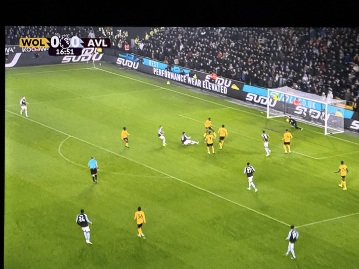 The image displays a football (soccer) match in progress, captured from a television screen, located in the city of Kyustendil, Bulgaria. The scoreboard in the upper left corner indicates a game between "WOL" (Wolverhampton Wanderers) and "AVL" (Aston Villa), with the score at 0-0 and the game time at 16:51. The scene depicts a brightly lit green football pitch under artificial stadium lights. Several players are actively engaged on the field. Near the right side of the frame, a white goal with a net is visible. A goalkeeper, dressed in a yellow and black kit, is on the ground, diving or sliding towards the left side of the goal. Multiple players in yellow/orange kits are positioned around the penalty area, with some facing the goal. One player in a white and maroon kit is on the ground near the goal mouth, suggesting a fall or tackle. Another player in a white and maroon kit, bearing the number 27, stands further back, facing the goal. A referee, dressed in a light blue shirt and black shorts, stands near the center of the field, observing the play. Other players in both yellow/orange and white/maroon kits are distributed across the field. Advertising hoardings displaying "SUDU," "PERFORMANCE WEAR ELEVATED," and "SUJU.CO.UK" line the back of the pitch behind the goal and along the sideline. A large, densely packed crowd of spectators is visible in the stadium stands, occupying the background above the advertising boards.