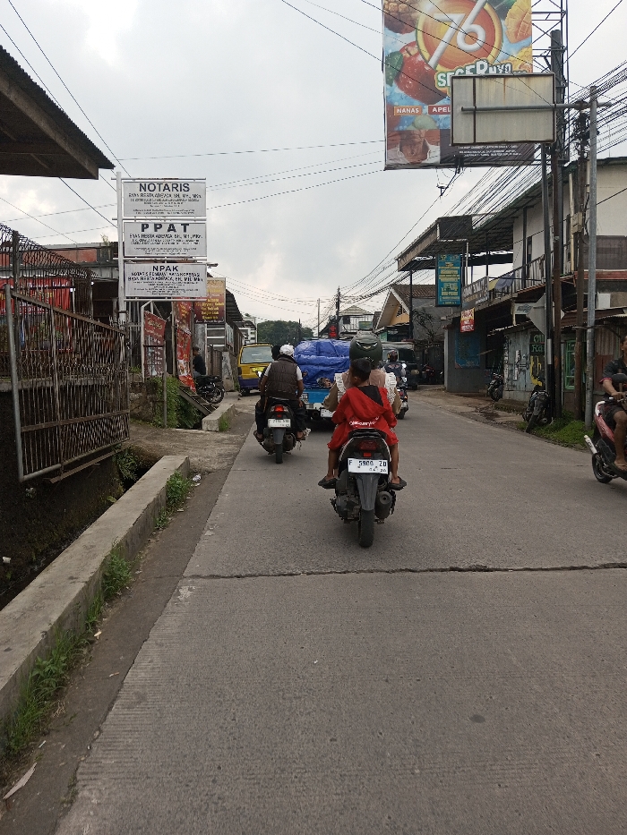 The scene depicts an overcast daytime street view in the city of Sandamal Eliya, Sri Lanka, characterized by an urban environment with dense infrastructure. An asphalt road, displaying minor cracks and seams, serves as the central thoroughfare. **People and Actions:** Several individuals are operating or riding on motorcycles, moving away from the viewer. In the immediate foreground, a person is driving a dark-colored scooter with a child, wearing a red long-sleeved top, seated on the passenger seat behind them, both facing forward. A second scooter directly behind has an adult driver, wearing a dark vest and helmet, also with a passenger. A third person is partially visible on a scooter positioned to the far right. Another individual is seated near the 'NOTARIS' signs on the left side of the road. **Objects and Environment:** * **Vehicles:** The foreground scooter has a license plate "F 5900 ZD". The scooter behind it has a partially visible license plate "715 TSK". A yellow van or light truck, possibly carrying items under a blue tarp, is visible further down the road on the left. * **Signage (Left):** Three prominent white rectangular signs are stacked vertically on the left. The top sign reads "NOTARIS," the middle "PPAT," and the bottom "NPAK," with additional text in Indonesian, including professional titles and office details. * **Signage (Right):** A large, elevated billboard advertises "Sprite," featuring images of fruit and the words "NANAS" (pineapple) and "APEL" (apple). A smaller blue sign is affixed to a building below the billboard. * **Infrastructure:** A concrete drainage ditch with some overgrown grass runs along the left edge of the road, alongside a dark metal fence. Numerous utility poles support a dense network of black electrical and communication wires that crisscross the sky. * **Buildings:** A mix of multi-story and single-story buildings with various architectural styles, including visible balconies and corrugated metal roofs, line both sides of the street, suggesting commercial and residential use. The sky is uniformly overcast.