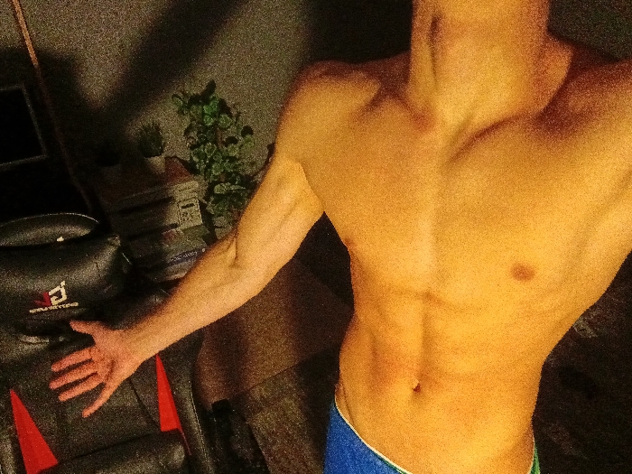 A man is shirtless, showcasing a toned physique, including visible abs and chest muscles. He is wearing blue and green athletic shorts or underwear. One arm is outstretched with an open hand. The background is a dimly lit room, with a black chair with red accents partially visible. There is also a small decorative building model and a plant on a surface behind the chair. The image is slightly grainy.