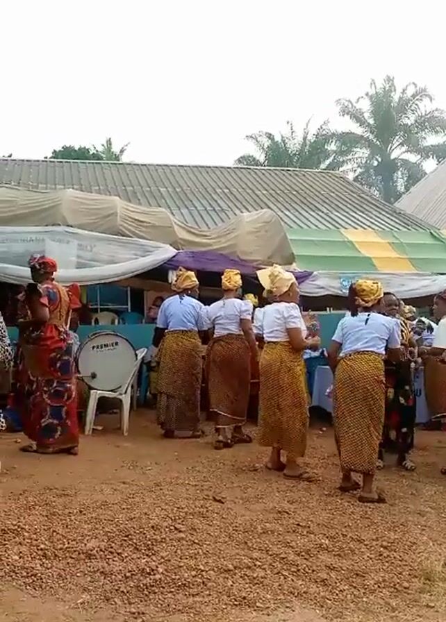 group of women gathered outdoors, likely at a celebration or event. Most of the women are dressed in similar attire: a white top, a yellow and brown patterned skirt, and a matching headwrap. Some wear different clothing, including a red skirt with a pattern and a patterned dress. They stand on a reddish-brown dirt ground, and some appear to be dancing or moving to the music. A drummer sits on a white chair, playing a drum set. In the background, there is a large tent or awning with a multi-colored roof. Trees and buildings are visible in the far background.