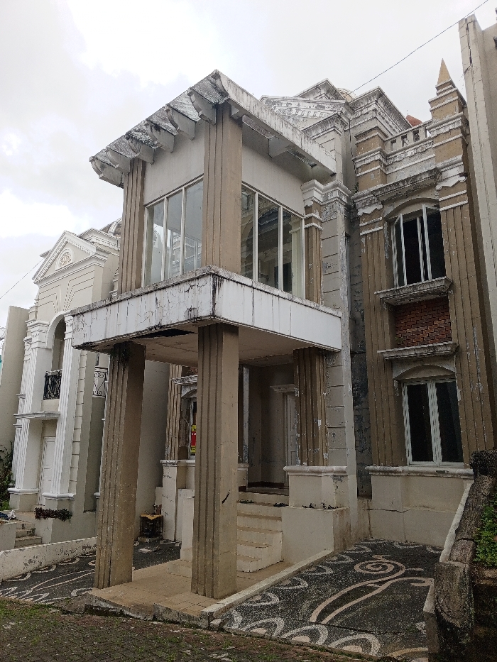 The image displays a multi-story residential building with classical architectural elements in a state of significant disrepair, located in Unknown, Unknown, under an overcast sky