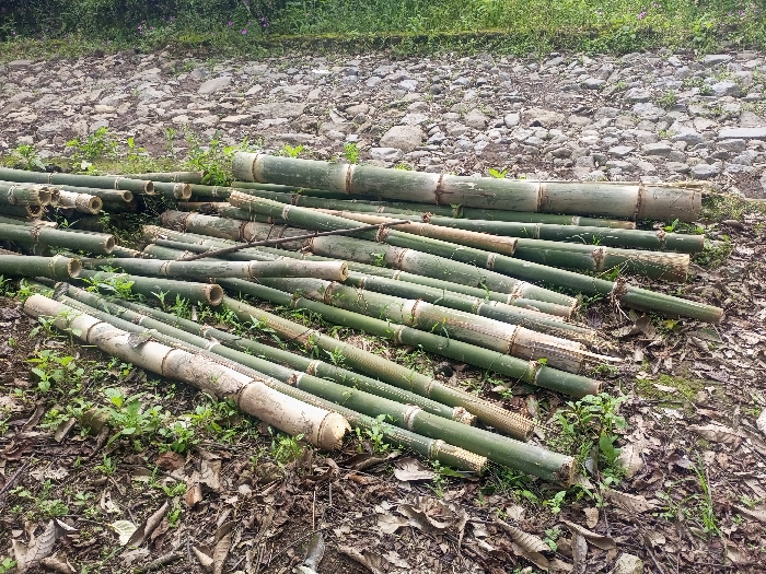 In Pacet, Indonesia, a substantial pile of cut bamboo stalks rests on the ground