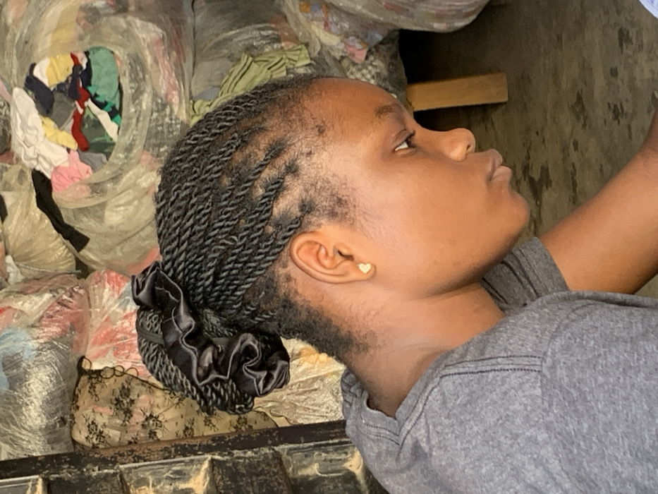 A young individual, depicted in profile and facing right, is observed looking downwards in what appears to be an indoor or semi-enclosed commercial setting within Oyo, Nigeria. The subject has dark skin and black hair styled in numerous small twists, gathered into a bun secured by a black satin scrunchie. A small, gold-colored heart-shaped stud earring is present in the visible right earlobe. The individual is wearing a grey short-sleeved t-shirt with visible stitching along the shoulder. The background is dominated by a dense accumulation of large, translucent plastic bags, all filled with bundled, multi-colored textiles, suggesting a stock of clothing or fabric for sale or storage. A dark, possibly damp or stained, ground surface is visible in the lower right, alongside a partial wooden support structure. No direct interactions or specific actions are discernible within the frame beyond the subject's focused downward gaze.