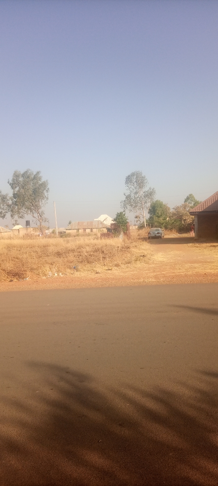 A sunny daytime shot depicts a rural landscape with a clear sky. An empty road occupies the foreground, leading to a grassy area with scattered trees. Buildings, including what appears to be a house with a metal roof, are visible in the background. A car sits in the distance. The overall scene conveys a sense of dryness and open space, potentially in a developing country.