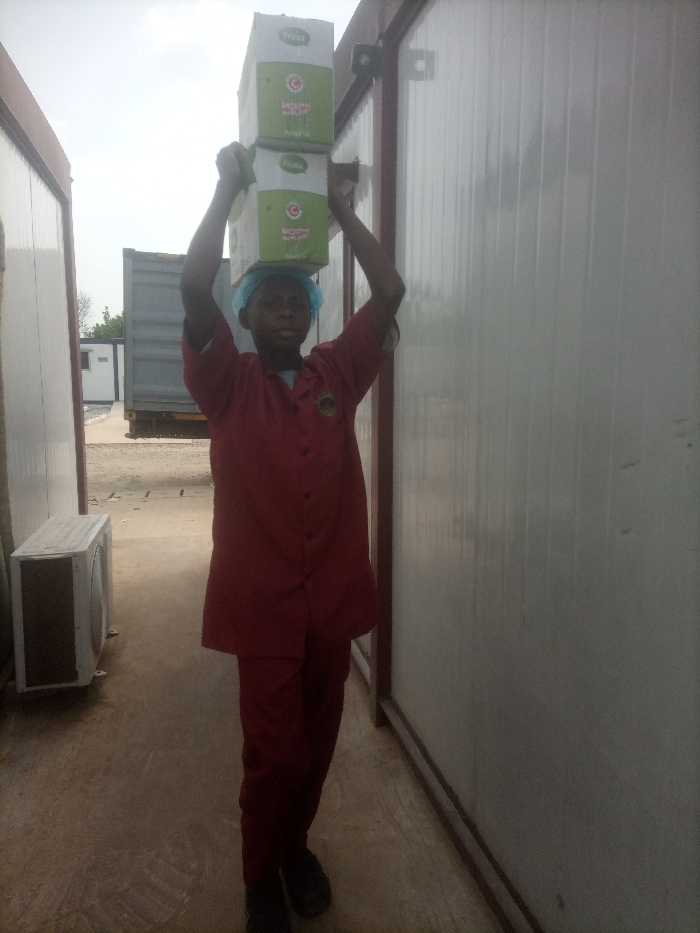 In Opete, Nigeria, an individual, likely female, stands facing forward in a narrow outdoor passageway. She wears a red uniform consisting of a long-sleeved tunic with an emblem on the left chest, matching trousers, a light blue hairnet, and dark shoes. Two light green and white rectangular boxes, branded with "Fruta" and a circular green logo containing "CROCODILE" text, are stacked on her head and supported by her raised arms. To her immediate left, a white outdoor air conditioning unit is positioned on the ground. The passageway is bordered by two white, corrugated-panel modular structures. In the background, a large dark shipping container, a smaller white structure, sparse vegetation, and an overcast sky are visible. The ground is a light-colored paved or concrete surface.