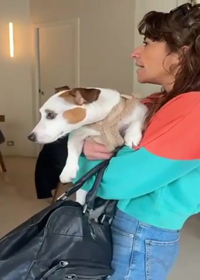 A woman stands indoors, holding a white and brown Jack Russell terrier dog in her arms. The dog wears a tan harness. The woman is wearing a two-toned sweatshirt, light blue jeans, and carries a black leather bag on her shoulder. She is looking to the right, seemingly speaking to someone out of view. The room appears to be a living or common area of a home, with a partially visible bed and other furniture in the background. The lighting in the room is bright and natural.