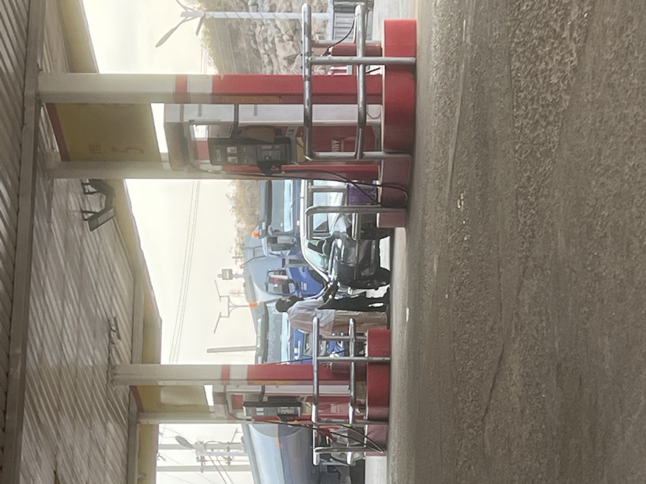 A gas station scene shows a row of pumps under an awning, with red and white structures. In the background, several large trucks, one blue, are lined up. A person in a light-colored shirt and pants appears to be pumping gas into a dark-colored vehicle. The foreground consists of a concrete surface with varied textures. The overall scene is captured in a somewhat hazy, daylight setting.