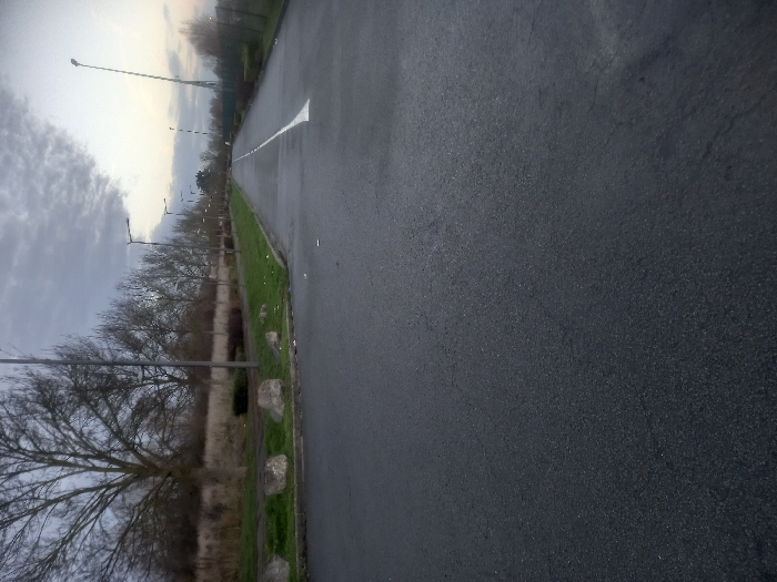 A straight asphalt road stretches into the distance under a cloudy sky. A single white line marks the center, directing the view. To the left, bare trees stand alongside a grassy ditch. Streetlights line the side of the road. The asphalt is dark and appears slightly damp. The scene suggests an overcast or early morning light.