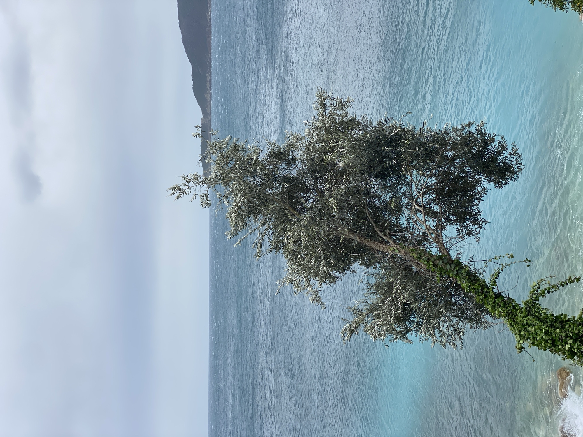 A scenic shot of the Adriatic Sea near Kamenovo, Montenegro. In the foreground, a tree grows from the edge of a small cliff, its branches overhanging the clear turquoise water. The tree's trunk is partially covered in ivy. The calm sea stretches toward the horizon, with a distant, hilly coastline visible. The sky is overcast.