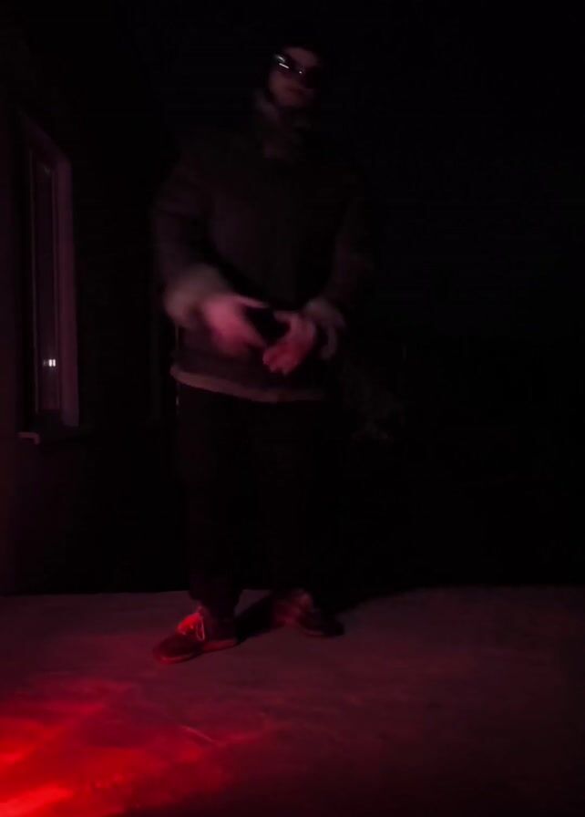person dancing in a dimly lit environment with a red light illuminating the ground. The person is wearing a dark jacket with a light-colored lining, dark pants, and black shoes with red laces and soles. They are also wearing dark sunglasses and a hat. The person is moving their arms and legs in a rhythmic manner, seemingly enjoying the music. Behind them is a dark building with a window. The scene is dark, with only the red light providing illumination to the dancing figure and the ground around them.