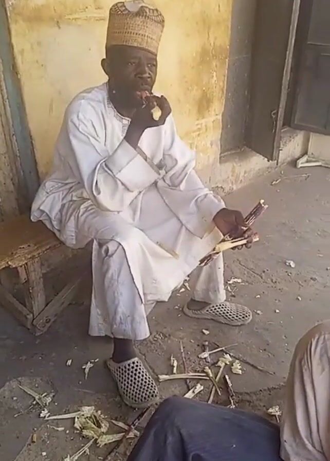 An elderly man with dark skin is seated on a low wooden stool outdoors, wearing a white tunic, white pants, a patterned knit cap, and patterned slip-on shoes