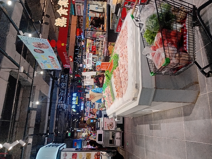 An indoor market scene shows a shopping cart filled with produce and meat, positioned next to a display case of raw meat on ice. The aisle stretches into the distance, lined with various stalls and signs in Asian characters. Bright lighting illuminates the market, highlighting the diversity of goods available for purchase. People are seen browsing the merchandise.
