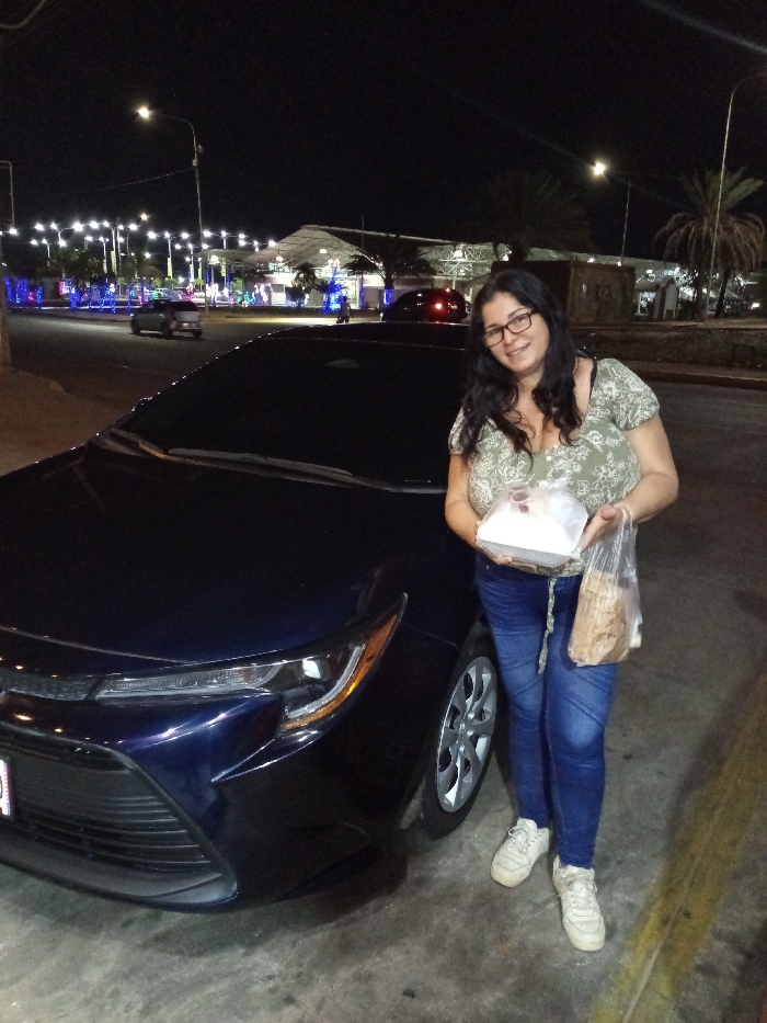 An adult female stands at night next to the front left quarter of a dark blue Toyota Corolla sedan. She is positioned near the driver's side front fender, holding a white takeout box with a clear lid in one hand and a clear plastic bag containing bread-like items in the other. The woman, wearing glasses, a light-colored patterned short-sleeved top, blue jeans, and white sneakers, smiles directly at the camera. The setting is an outdoor paved area. In the background, across a street, a large commercial building identified as the **Central Madeirense supermarket on Av. Jesús Rafael Leandro in Juan Griego, Venezuela**, is brightly illuminated, featuring a white roof structure and numerous decorative blue lights on surrounding trees or fixtures. Other vehicles are discernible on the street, and palm trees are visible further back.