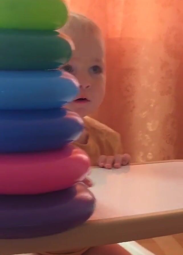 A baby sits in a high chair, facing the camera. The baby has fair skin, blond hair, and blue eyes. They wear a short-sleeved yellow shirt and yellow bottoms. The table of the high chair is white. The baby has their left hand resting on the table. In the first frame, a stack of colorful toy rings is visible next to the baby. The rings are stacked in the order of orange, green, dark green, blue, dark blue, pink, and purple. The baby looks to the left at the toy rings, then looks forward at the camera. The toys are knocked off the table, presumably by the baby. Behind the baby is a peach-colored curtain with a floral design.