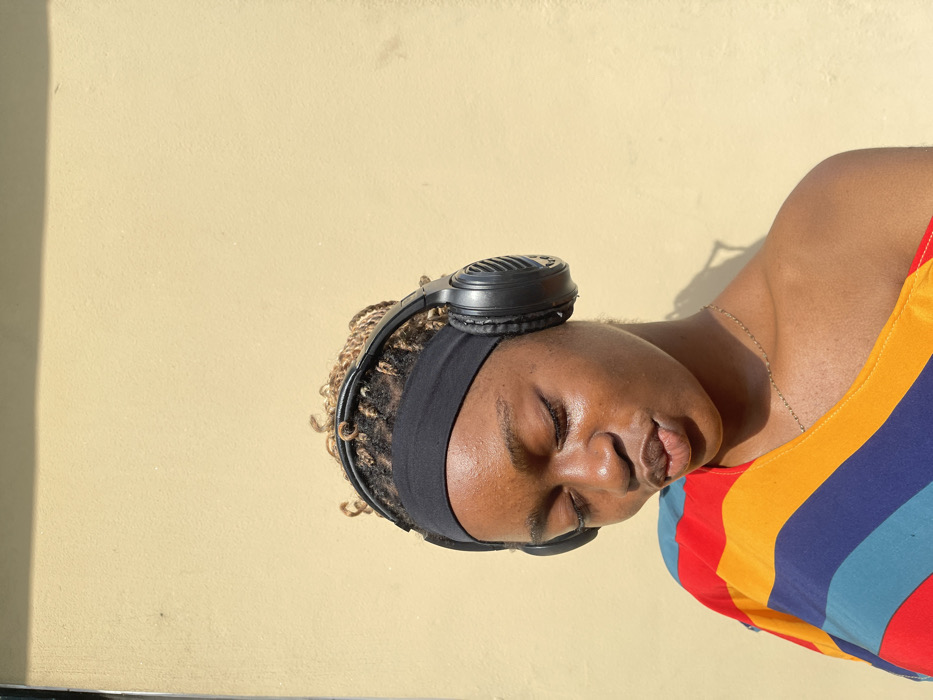A young Black female is depicted in a close-up against a plain, light yellow-beige wall under direct sunlight in Ado, Nigeria. She wears black over-ear headphones and a black headscarf over light-colored curly hair. Her eyes are closed, and her lips are pursed in an expressive manner. She is wearing a multi-colored garment featuring horizontal stripes of red, yellow, blue, and teal, along with a thin silver-colored necklace. Strong illumination from the left casts defined shadows on the wall behind her right shoulder and neck.