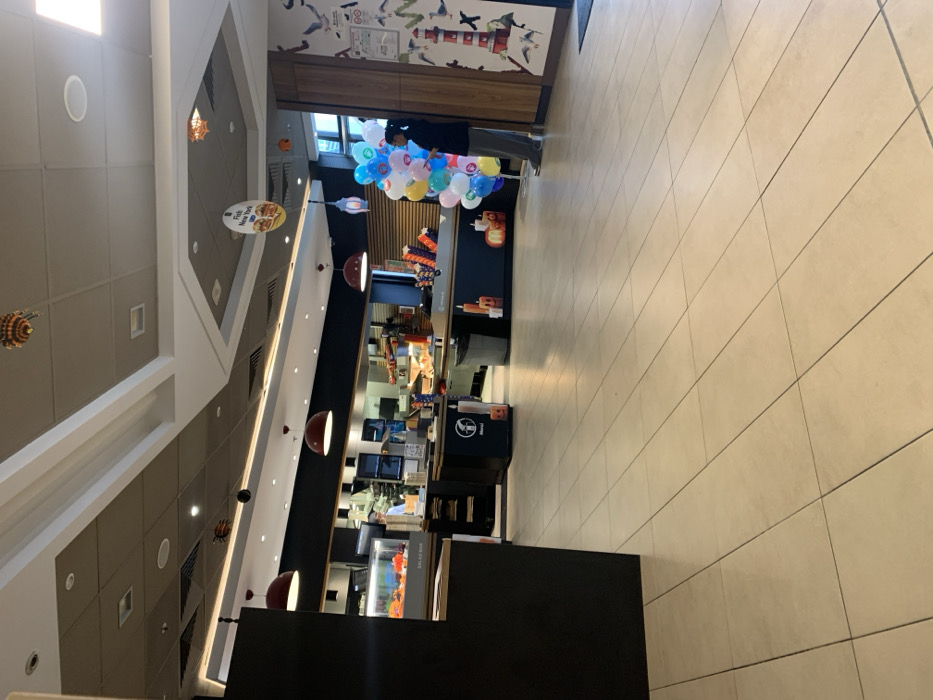 The image displays the interior of a McDonald's restaurant located in Fontenay-sous-Bois, France, viewed from the dining area towards the service counter and kitchen. The foreground features a clean, light-colored tiled floor. A dark, solid partition wall is present on the far left. In the midground, the primary service counter stretches across the width of the frame. This counter system is predominantly dark blue and black, with a "SALAD BAR" sign visible on a section to the left. Several dark blue counter units with an "M" logo and orange pumpkin-shaped decorations are positioned along the service line. Behind the counter, a brightly lit kitchen area with stainless steel surfaces and various equipment is visible. One male employee, wearing a blue shirt, is partially visible within the kitchen area. To the right of the counter, a female individual stands, facing the counter area. She is dressed in a dark jacket and light grey pants. Beside her is a large, vertical cluster of approximately 30-40 helium balloons in various colors, including light blue, yellow, white, and pink. The right wall features a decorative mural composed of stylized illustrations depicting seagulls, lighthouses, and nautical elements against a light background. A dark entrance mat is visible on the floor near this wall. The ceiling consists of a multi-layered design with white and grey acoustical tiles, integrating both rectangular and circular light fixtures, along with ventilation grilles. Several red dome-shaped pendant lights are suspended. Decorative elements, including a hanging rectangular sign advertising "Fish New York" and small dark spherical ornaments, are also visible suspended from the ceiling.