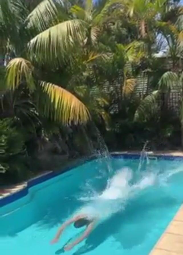 In a medium shot, a fair-skinned person wearing blue swim trunks dives headfirst into a rectangular swimming pool filled with light-blue water