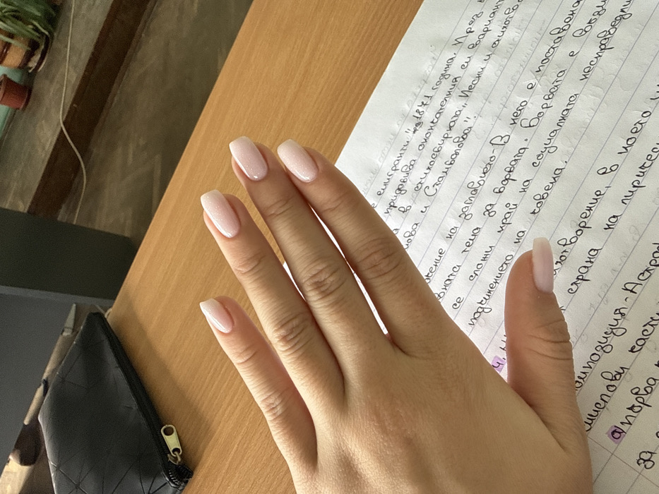 The scene depicts a light-skinned left hand resting palm-down on a white, lined notebook. The hand displays five fingers with light pink, shimmery gel manicures, shaped into a tapered square or soft coffin style. The notebook contains handwritten text in black ink, utilizing Cyrillic script. Visible Bulgarian phrases include "емигранти", "1841 година", "стихосбирката", "Песни и стихове", "Стамболова", "борбата", and "социалната несправедливост". Portions of the text are highlighted with a light purple marker. A black, textured wallet with a brass-colored zipper pull is situated on the wooden surface in the upper left quadrant. The objects rest on a light brown wooden desk or table. The background is out of focus, showing a dark gray vertical structure on the left and two potted plants on the right, housed in a reddish-brown terracotta pot and a striped brown and beige pot, respectively. The presence of Bulgarian text indicates a location within Bulgaria; however, no specific visual data within the image identifies the precise location as Cherven Bryag.