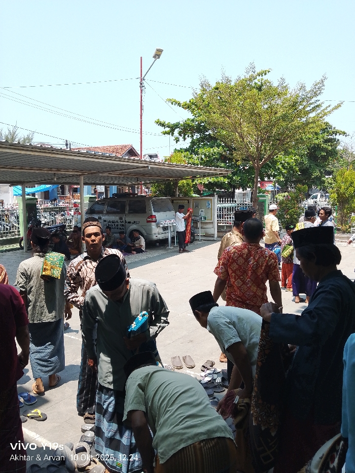 The image depicts an outdoor gathering of numerous individuals, predominantly adult males, in Jagapura Lor, Indonesia, under bright midday sunlight at approximately 12:24 on October 10, 2025. In the foreground, a paved area shows several men engaged in various actions. Multiple pairs of sandals and shoes are scattered on the ground. One man, wearing a grey long-sleeved shirt and a patterned sarong, is bending forward, holding a blue folded textile. To his left, another man in a patterned brown and white long-sleeved shirt and sarong looks towards the camera. Further right, a man in a light-colored shirt and patterned sarong is also bending over the footwear. Most men are dressed in sarongs and long-sleeved shirts, with many wearing peci or similar caps. In the mid-ground, a silver minivan with text including "JAGA M" and "MUHARRAM" is parked under a light-colored metal-roofed shelter. A man in a white shirt and sarong is seen standing near the minivan, handling a red and white patterned textile. Other individuals are seated or standing under this shelter. Beyond the shelter, a white metal fence or gate is visible, with informational boards attached. Residential buildings with red-tiled roofs are discernible in the background. The background features a tall red pole with a street light fixture at its apex, against a clear blue sky. A large, leafy green tree with a wide canopy stands prominently to the right of the scene, providing natural shade.