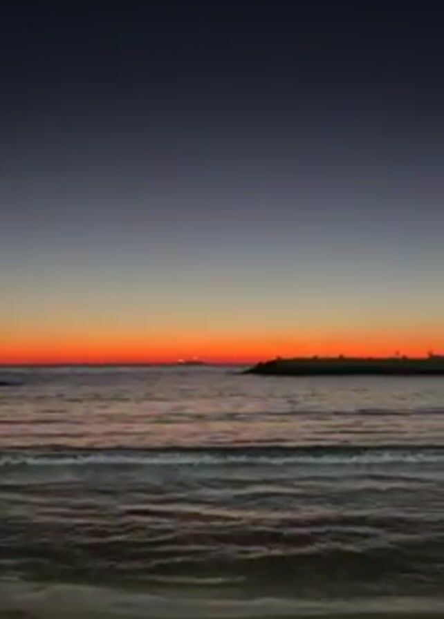 sunset view over the ocean. The sky transitions from a dark blue at the top to a vivid orange near the horizon. The water is dark and rippling with gentle waves. A dark landmass stretches across the horizon with some lights visible on it. The camera is stable, providing a still view of the scene.