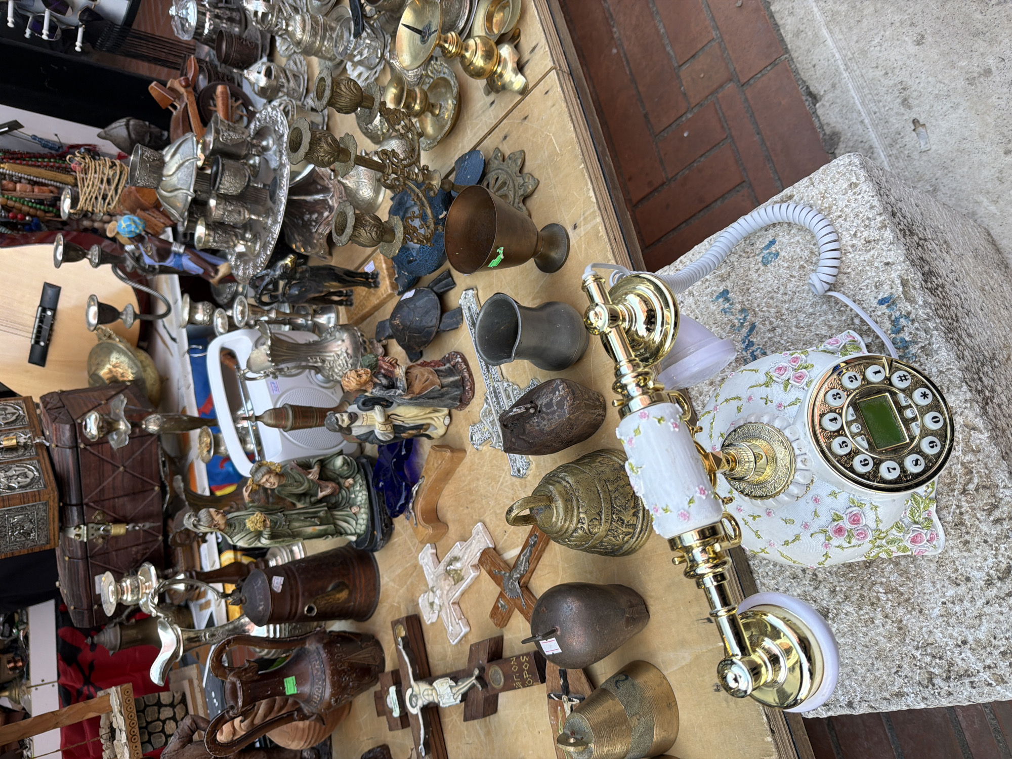 The image captures a street market scene, possibly in Tirana, Albania, displaying a variety of antique and religious artifacts. The items are arranged on a wooden table next to a concrete block. Objects include religious figurines, crosses, metal cups, and ornate silver and brass candleholders. A vintage-style telephone with a floral pattern and gold accents lies on the concrete block. No people are visible in the frame. The foreground consists of these objects, and the background includes brick paving.