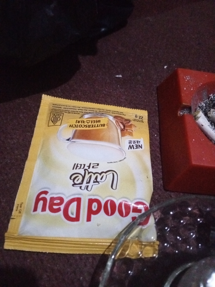 The image presents a dimly lit, close-up view of objects resting on a dark, textured surface, likely indoors in Pacet, Indonesia. In the center-left, an intact yellow and white sachet of "Good Day Latte Butterscotch" instant coffee mix is positioned. The sachet displays the brand "Good Day" in red lettering, "Latte" in a black script, and "Butterscotch" on a yellow banner. Accompanying text is visible in English, Korean ("비터스카치," "라떼," "새로운"), and Indonesian, including a "HALAL" certification logo and "22 G" indicating weight. Manufacturer details "PT Santos Jaya Abadi, Sidoarjo 61257, Indonesia" are partially legible. The sachet is oriented such that the "Good Day" text appears upside down relative to the cup graphic on the sachet. To the right of the sachet, a square, red plastic ashtray is visible, heavily used. It contains several extinguished cigarette butts and a significant amount of grey ash. One cigarette butt is resting in a groove on the ashtray's rim. In the lower foreground, a curved section of a clear glass object, possibly the rim of a drinking glass or bowl, is partially visible. The upper left quadrant features an indistinct dark object against the dark background. The overall lighting is low, contributing to a slightly shadowed and muted scene.