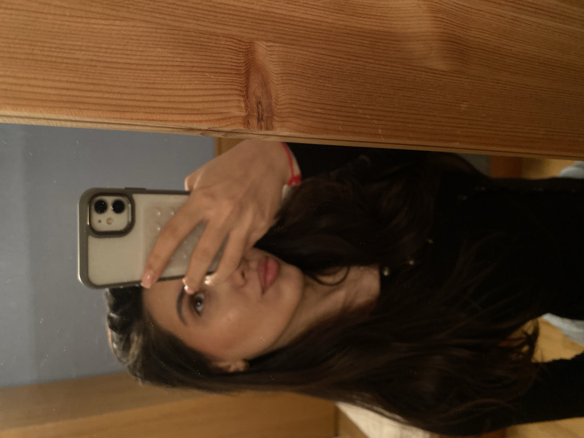 The image depicts a woman taking a selfie in a mirror. She is holding an iPhone 11 or 12 with a grey case in her right hand. The woman has dark hair, brown eyes, and is wearing a black top. A red bracelet is visible on her wrist. The background is a light blue wall, and the top of the mirror frame appears to be made of wood. The location cannot be determined from the image; there is no indication of it being in Björklinge, Sweden.