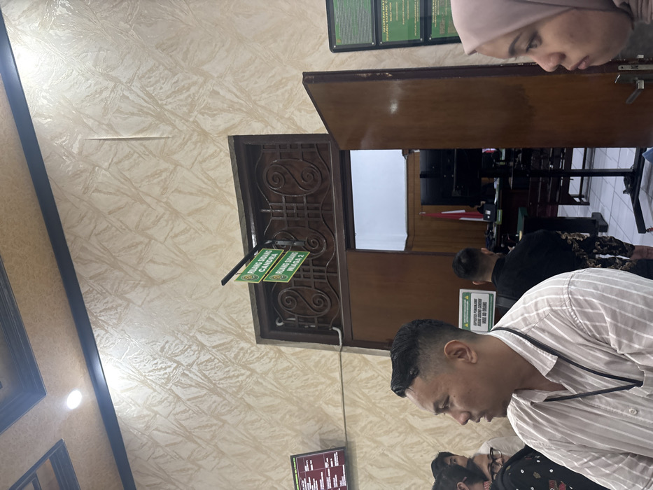 An indoor shot shows a room with light beige patterned walls. A doorway with decorative latticework displays signs reading "RUANG SIDANG CANDRA" and "RUANG SIDANG NIAGA 2." People are visible, including a man in a striped shirt, a woman in a hijab, and others seated in the background, possibly in a courtroom setting. Wall-mounted signs and a partial view of a desk with chairs are also observable.