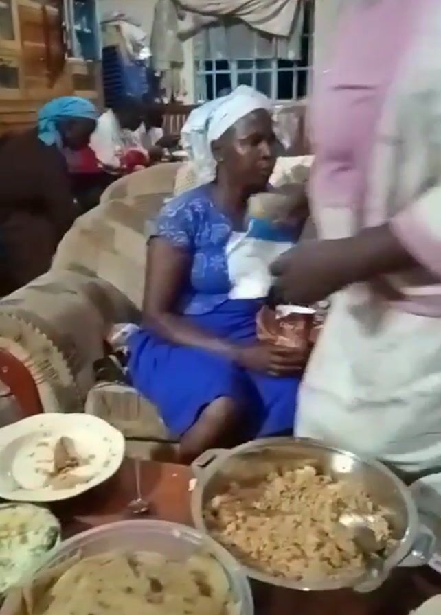 group of people inside a room, possibly a house, sitting and eating. Several individuals are visible, including women wearing head coverings and a young person in a school uniform. There are plates of food on a table along with several serving dishes filled with various dishes. People are eating from their plates. A woman in a light pink and white outfit is standing and interacting with the people seated at the table. The room appears modestly furnished, with a cabinet in the background. The video is shaky and the focus shifts, but the overall impression is of a group of people sharing a meal together.
