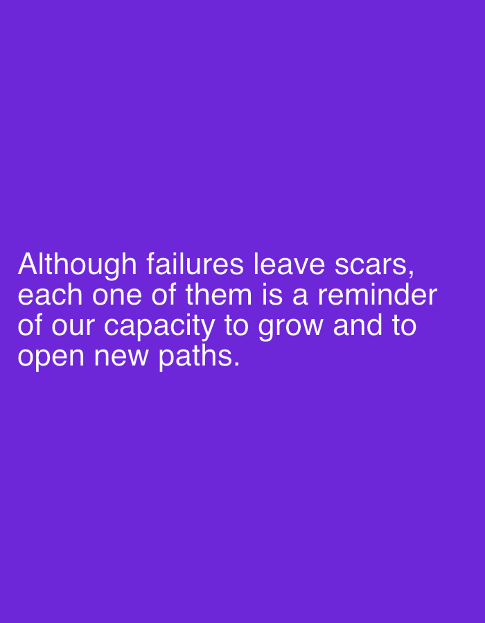 The image displays white text on a purple background. The text reads, "Although failures leave scars, each one of them is a reminder of our capacity to grow and to open new paths." The message conveys a positive outlook on failure, suggesting that scars from past failures serve as reminders of our ability to learn, adapt, and create new opportunities.