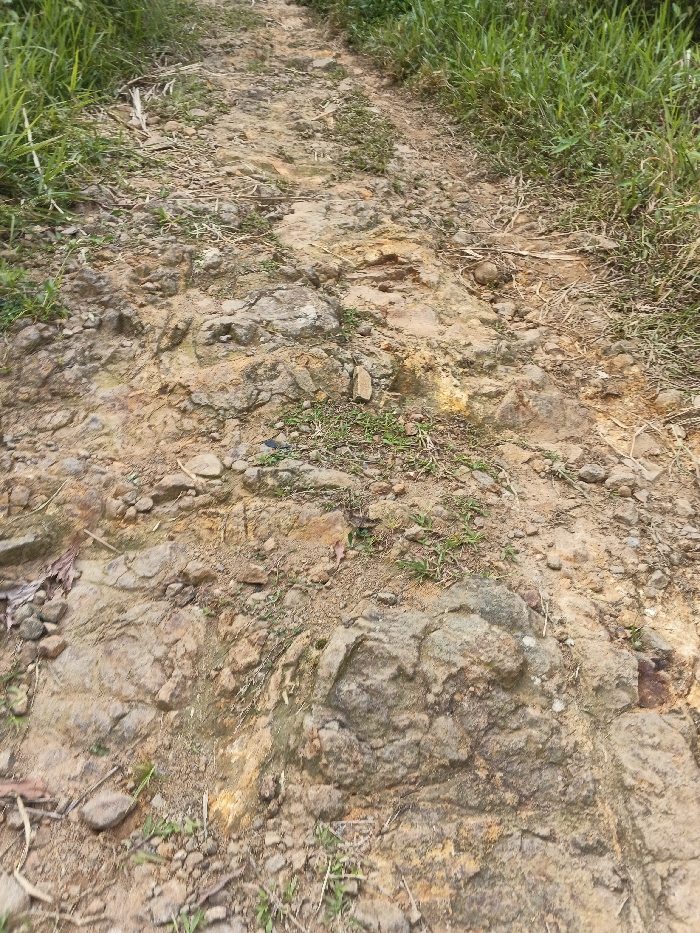 The image presents a ground-level view of an unpaved, uneven dirt path