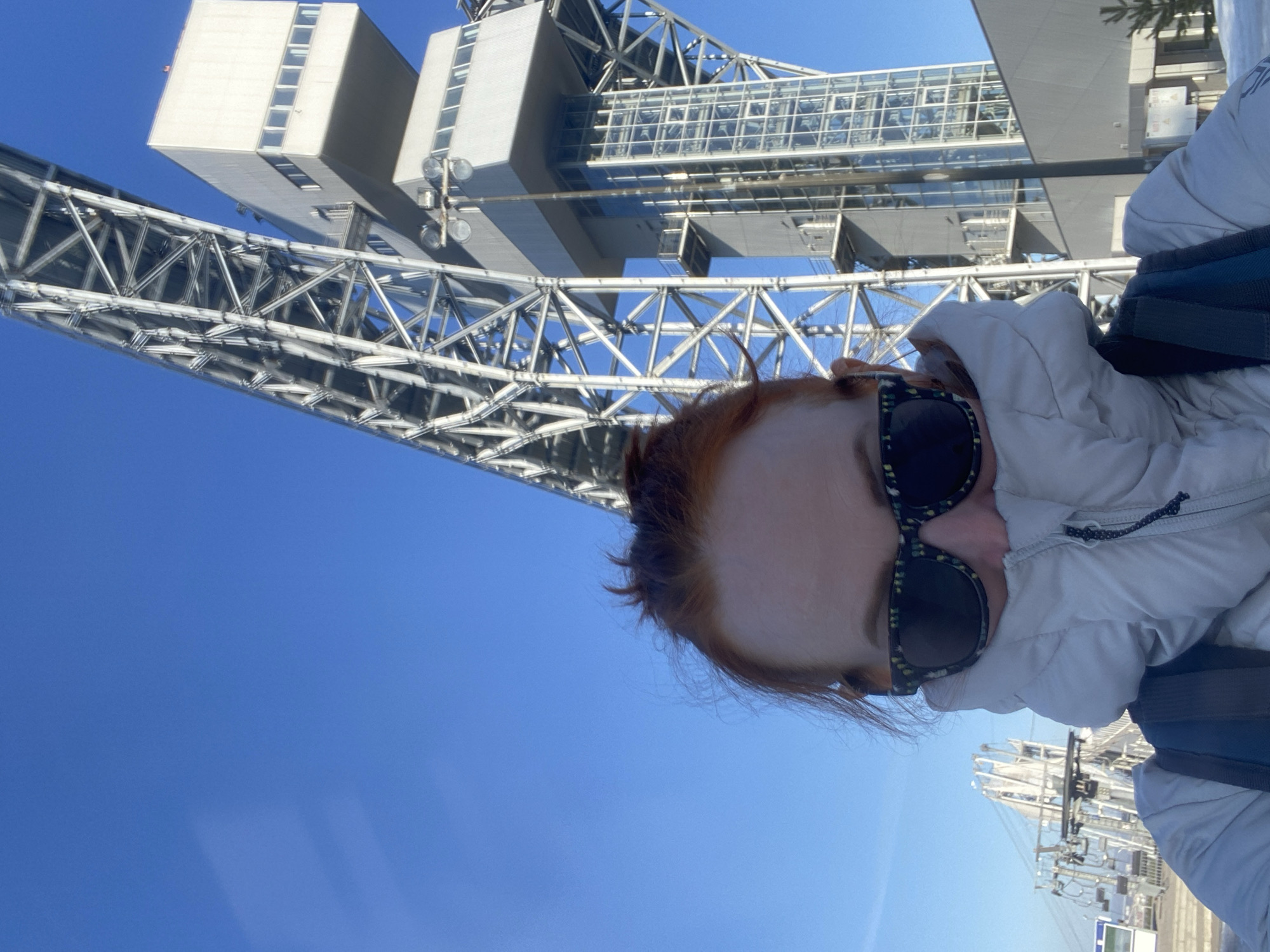A daytime eye-level shot, rotated for an altered perspective, features a person in the foreground against an industrial structure and clear blue sky in Прикамский, Russia. The person is wearing sunglasses and a light-colored puffer jacket. A metal structure with complex triangular supports is visible. The background includes a tall, modern building with windows.