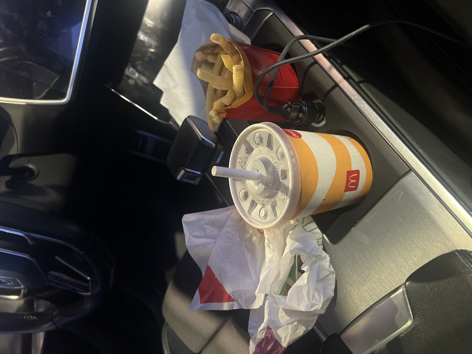 The scene depicts the interior of a vehicle, located in Cukarica Urban Municipality, Serbia. A McDonald's branded paper cup, white with orange stripes, a white plastic lid, and a white straw, occupies a cup holder on the center console. Adjacent to it, a red McDonald's carton filled with golden-brown French fries is visible. A black car power adapter is plugged into a 12V auxiliary power outlet next to the fries, with a dark braided cable extending from it. To the left of the cup, a crumpled white fast-food wrapper, showing faint red and green elements, rests on a dark upholstered surface, likely a seat. Portions of a dark, possibly leather, steering wheel and brushed metal trim on the console are also visible. The overall lighting is dim. No individuals are present in the image.