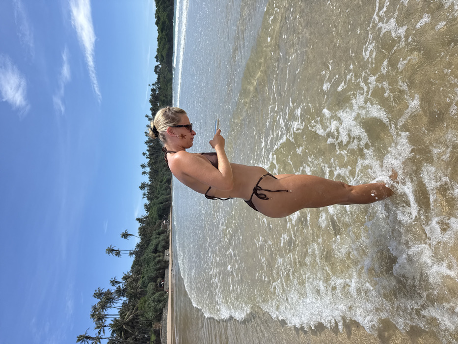 A fair-skinned woman in a brown bikini stands in the shallow surf of a tropical beach, looking at a cell phone. She has a starfish-shaped decoration on her cheek. Blue sky with sparse clouds is visible, along with a line of palm trees along the coast. The image is rotated 90 degrees clockwise.