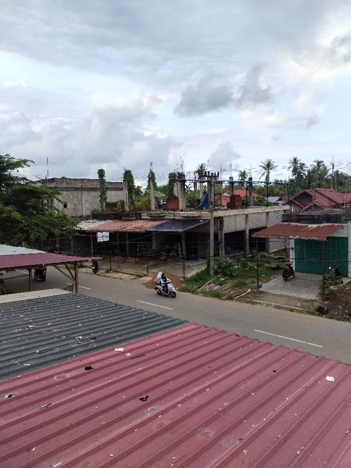 An elevated view captures a street scene in Mns Alue, Indonesia, under an overcast sky. In the foreground, two corrugated metal roofs are visible; the closest is red, and the one behind it is dark grey, both exhibiting minor surface debris. The midground features an asphalt road where a white scooter, carrying two individuals, moves from left to right. The driver wears a white head covering. A red object is visible with the passenger. Adjacent to the road, on the left, a rudimentary wooden-framed shelter covers two parked motorcycles. On the right, a dark motorcycle is parked near a building with a green roll-up door. Construction materials, including wooden planks, are scattered along the roadside. The background consists of multiple structures, including a large, multi-story concrete building under active construction, evidenced by exposed rebar and incomplete concrete pillars, some partially covered by climbing vines. Other concrete structures appear as open bays, possibly intended for commercial use. Further back, red-tiled roofs of residential buildings are interspersed with dense green foliage and numerous palm trees. Utility poles or frames are also present within the background structures.