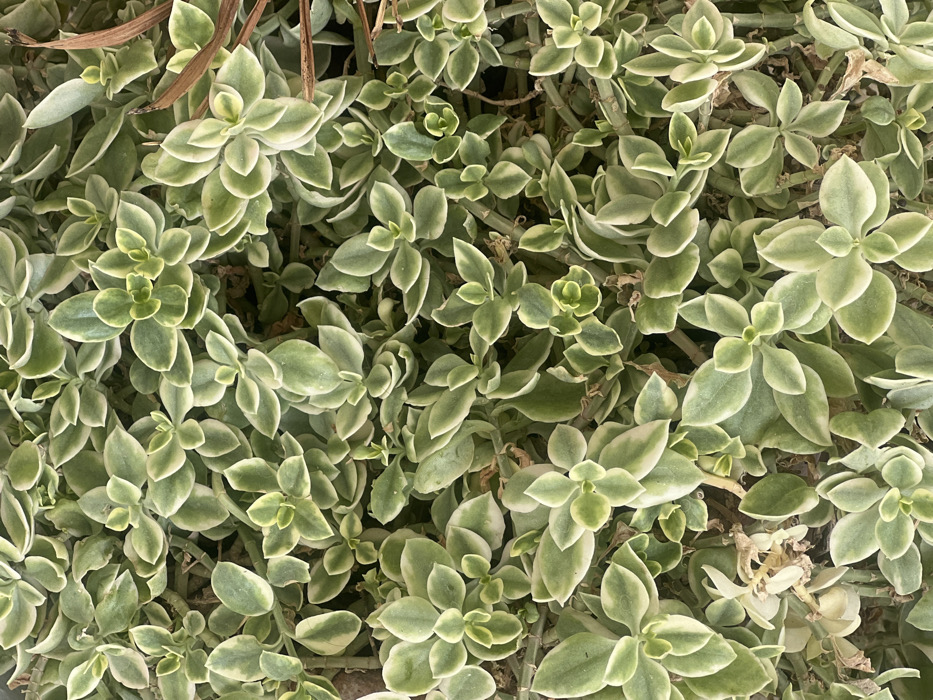 The image presents a close-up, top-down view of dense, variegated groundcover vegetation, located in Mansehra, Pakistan. The scene is entirely filled with numerous small, fleshy leaves, approximately 1-2 cm in length, characterized by light green to yellowish-green centers and distinct creamy white or pale yellow margins. These oval to spatulate-shaped leaves are arranged in opposite pairs or small rosettes along slender, branching stems of a brownish-green or tan coloration, forming a cohesive mat. Scattered among the living foliage are a few thin, dried, brown plant fragments. No people, animals, or artificial structures are visible. The environment appears to be an outdoor setting under diffuse, even lighting, without prominent shadows.