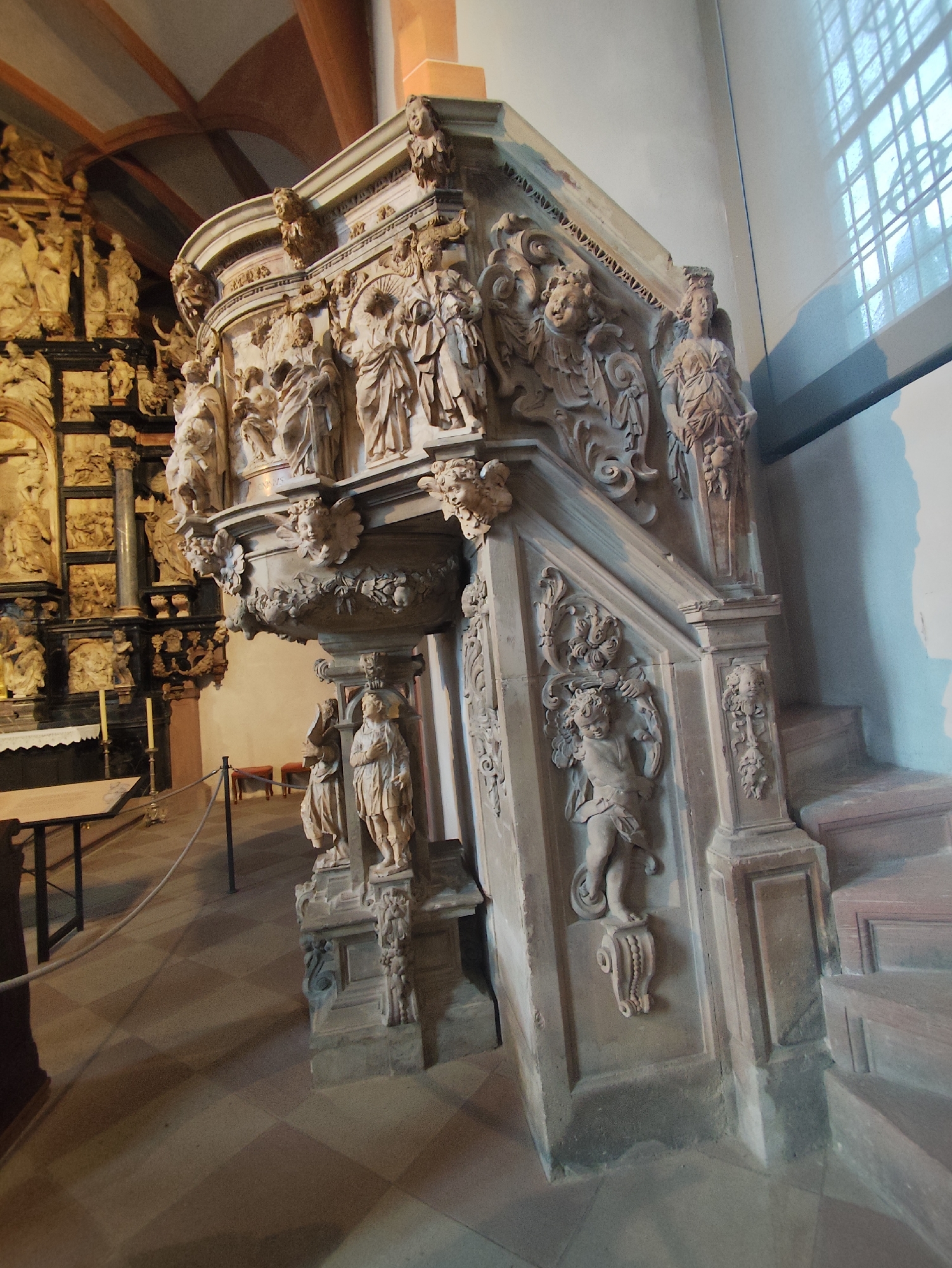 The image displays an intricately carved stone pulpit and its integrated staircase, positioned within a large religious edifice, specifically the St. Peter and Alexander Collegiate Church in Aschaffenburg, Germany. The pulpit, constructed from light-colored stone, likely sandstone, features extensive Baroque-style sculptural decoration. Its multi-faceted body is adorned with numerous carved figures, depicting individuals in ecclesiastical or historical attire, religious scenes, angels, and cherubs, interspersed with floral and architectural motifs. The base of the pulpit is supported by standing carved figures. An attached staircase, equally ornate, descends to the right, exhibiting further carvings of figures and decorative elements along its balustrade. The stairs themselves are plain, solid blocks. In the background to the left, a large, multi-tiered altarpiece or reredos, also heavily carved with numerous figures and golden accents, is visible. The floor is covered with a checkerboard pattern of alternating light and dark square tiles. A plain wooden table with a white cloth and two yellow candles is visible near the altarpiece, cordoned off by a dark rope barrier. The room features a high vaulted ceiling with visible structural elements in the upper left. A large rectangular window with a grid pattern is present on the right wall, admitting natural light and casting shadows on the wall and floor. No individuals are present in the scene.