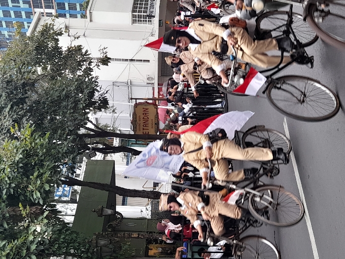 The image captures a daytime scene on a paved street in Surabaya, Indonesia, specifically along Jalan Tunjungan, evidenced by a brown sign reading "GEDUNG WISATA ETANDAN SURABAYA." In the foreground, three women are actively cycling dark-colored vintage-style bicycles from right to left. They are uniformly dressed in tan long-sleeved shirts, tan pants, black boots, and brimmed hats worn with sunglasses. Each bicycle displays a small red and white Indonesian flag. The central cyclist's bicycle additionally features a larger white flag with a blue emblem. Numerous individuals, identified as spectators, line both sides of the street in the background; some hold umbrellas. The environment consists of multi-story buildings, including a prominent white, art-deco-style structure on the right and older buildings with green facades on the left, interspersed with mature trees and decorative street lamps. The scene depicts a public procession or event.