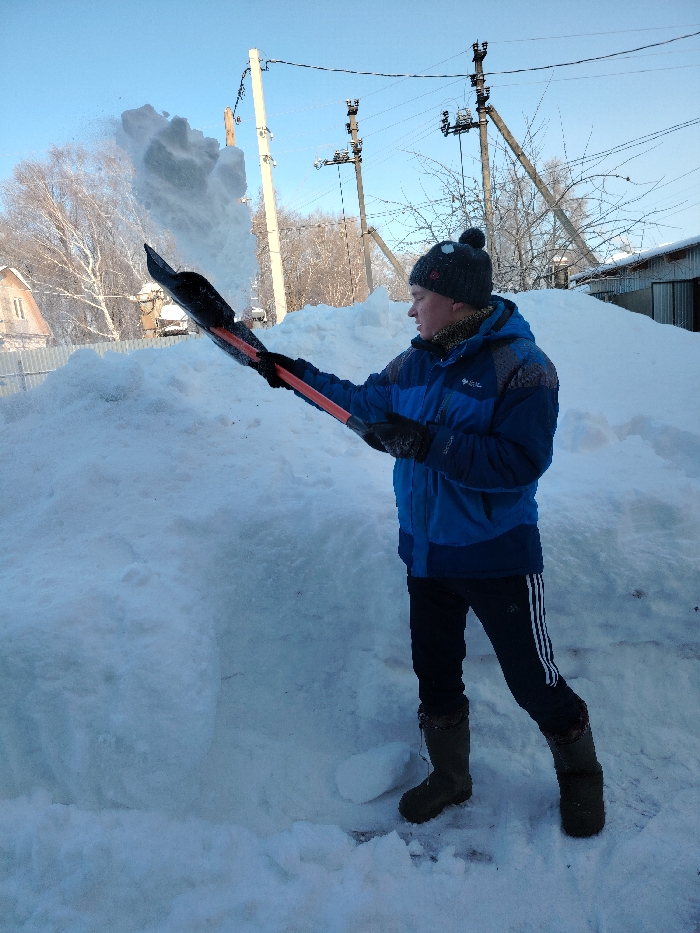 A person in a blue jacket, black pants with white stripes, and a hat is shoveling snow. They are standing in a large pile of snow and throwing snow off the top with a black shovel. Power lines and trees are visible in the background, along with a building and a fence. The sky is blue.