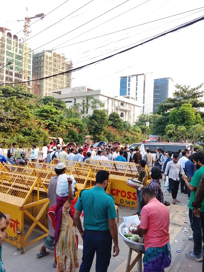 This image depicts a bustling urban street scene in Dhaka, Bangladesh. In the foreground, a row of yellow metallic crowd control barriers, some marked "DMP" (Dhaka Metropolitan Police) and "cross," delineates an area. A woman in a red and beige sari carries a large clear plastic water bottle on her head, walking from left to right, partially obscured by a man in a brown tunic and white prayer cap. To their right, a man in a teal short-sleeved uniform shirt and dark trousers stands with his back to the viewer, facing the crowd beyond the barriers. Adjacent to him, a street vendor in a pink shirt and patterned lungi prepares food in a large metal bowl on a portable stand, which contains sliced vegetables. Other individuals are partially visible in the immediate foreground, including one on the far right viewing a smartphone. Behind the barriers, a large crowd of predominantly men is gathered, extending across the width of the street. They are dressed in various casual and traditional attire. Several vehicles, including a white van with a red emergency light bar on its roof, are visible further down the street amidst the crowd. Green foliage and trees line the middle ground, separating the street level from the background structures. The background features a mix of urban development. On the left, two tall buildings are under construction, characterized by scaffolding and exposed frameworks; one displays distinct arched window designs. A construction crane is visible above the left-most building. In the center-right background, a modern white building with a prominent arched entrance stands amidst greenery. Further to the right, a tall, contemporary building with a reflective glass facade is visible. Numerous overhead utility wires crisscross the sky, which is bright and clear.