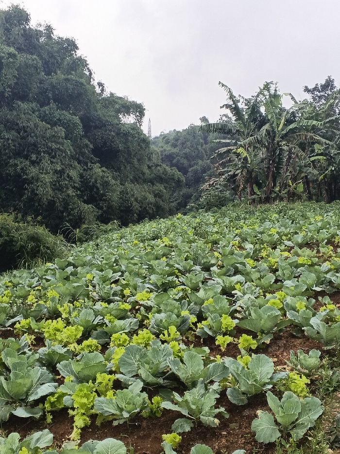 This image depicts a cultivated agricultural field on a slope in Makilala, Philippines. The foreground and midground feature numerous rows of green leafy plants, primarily mature cabbage heads and smaller, lighter green lettuce plants, growing in dark brown soil. To the left, a dense, dark green forest covers a steep hillside, extending upwards towards the horizon. To the right, a cluster of tall banana trees with large green leaves stands at the edge of the cultivated area, bordering more distant foliage. In the far background, partially obscured by the dense tree line and visible through a break, a tall, slender communication or power transmission tower can be seen on a distant hill. The sky overhead is overcast and light gray, indicating a cloudy day. No human figures or discernible man-made structures other than the distant tower are visible.